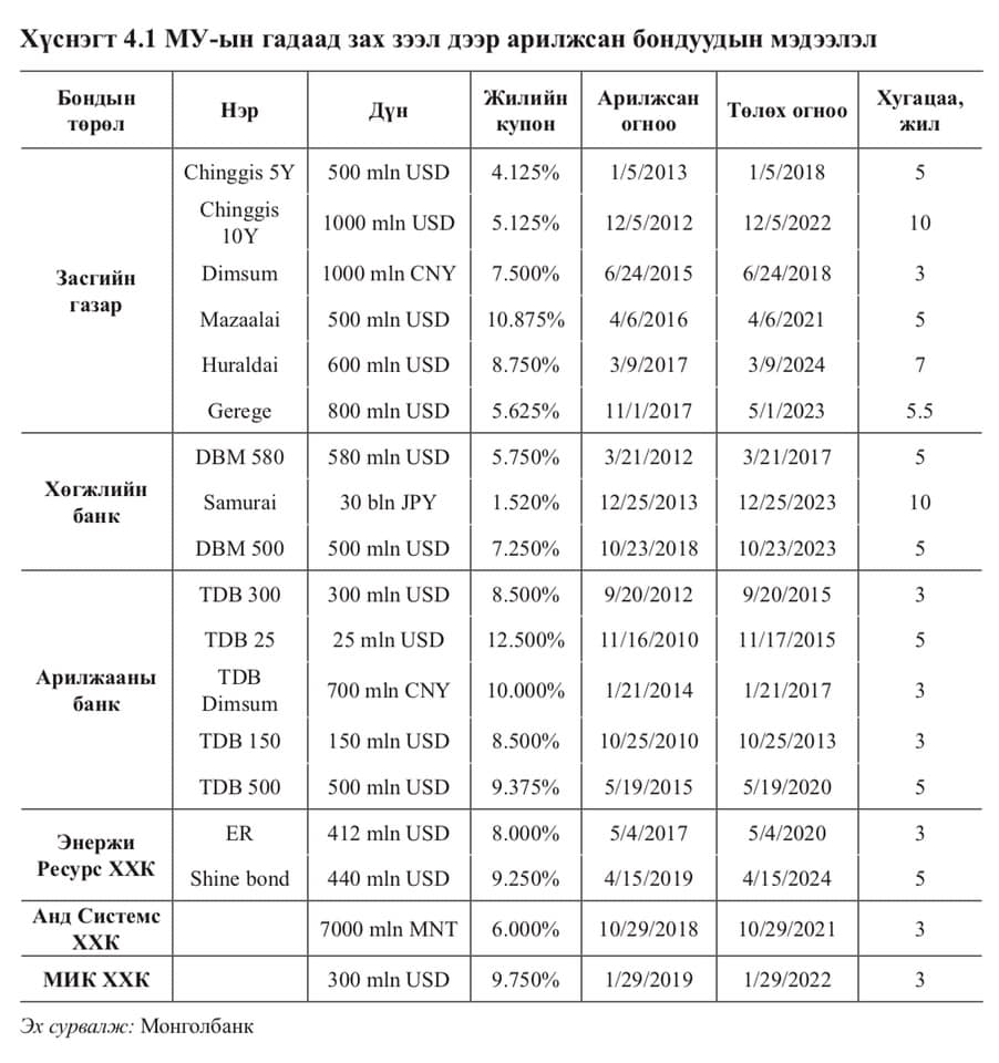 Ирэх дөрвөн жилд нийт 11 тэрбум ам.долларын гадаад өрийн эргэн төлөлт хүлээгдэж байна. Үүнээс Засгийн газарт 4.4 тэрбум ам.доллар (үүний 2.9 тэрбумын бондын төлбөр, бусад нь бусад зээл болон хүүний төлбөр)-ын үндсэн болон хүүний төлбөр хамаарна.