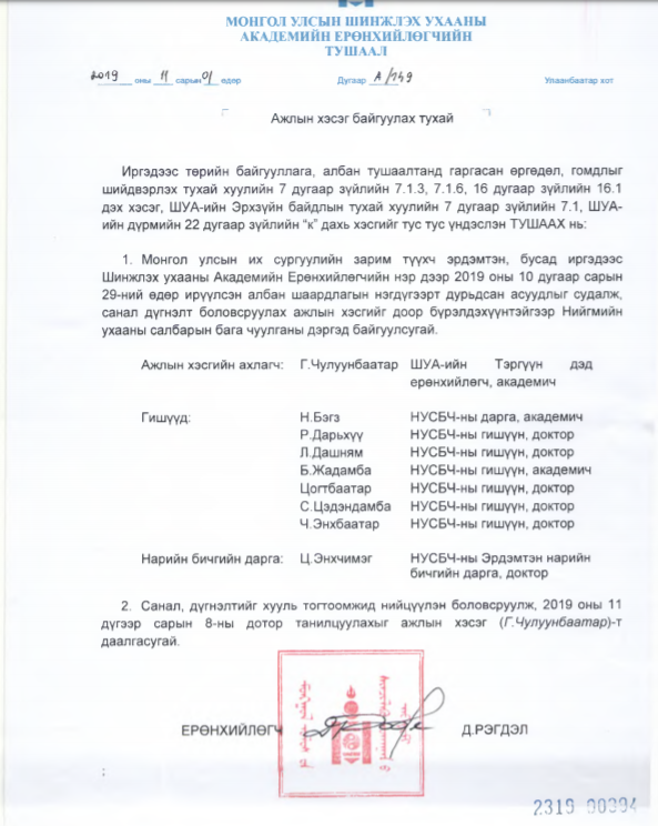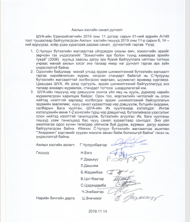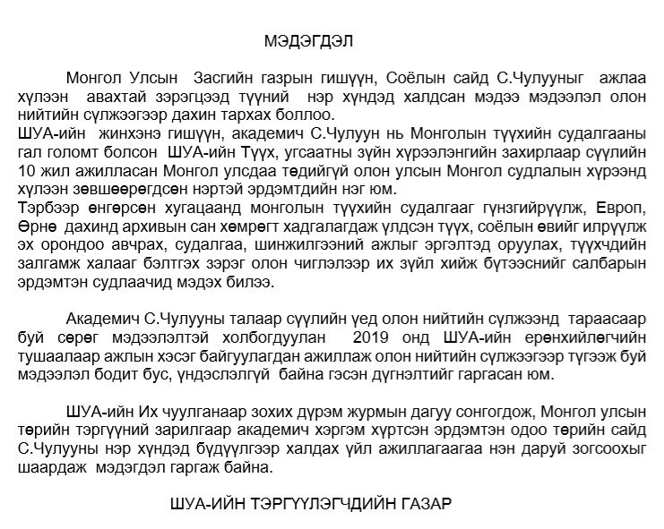 ШУА-ийн Их чуулганаар зохих дүрэм журмын дагуу сонгогдож, Монгол Улсын төрийн тэргүүний зарилгаар академич хэргэм хүртсэн эрдэмтэн, одоо төрийн сайд С.Чулууны нэр хүндэд бүдүүлгээр халдах үйл ажиллагаагаа нэн даруй зогсоохыг шаардаж,  мэдэгдэл гаргаж байна.