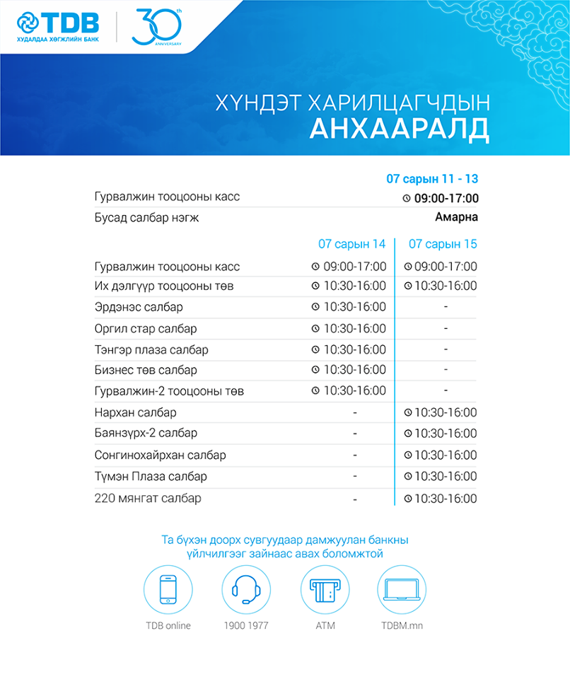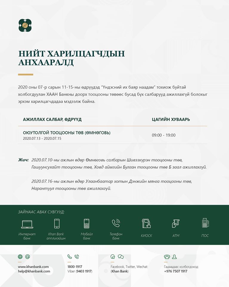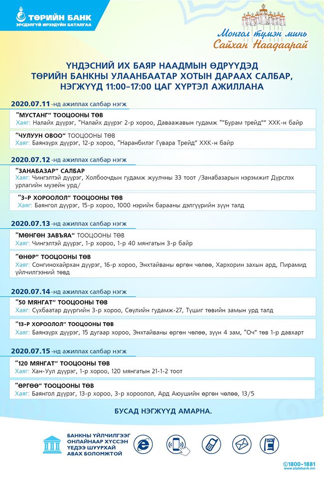 Баяр наадмын өдрүүдэд банкууд хэрхэн ажиллах талаарх мэдээллийг хүргэе.