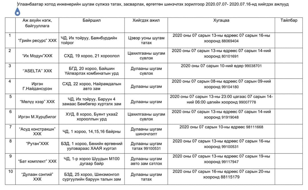 2020.07.07- 2020.07.16-ны хооронд зам хааж, хийгдэх ажлуудын байршил, мэдээллийг хүргэж байна.