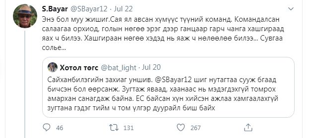 Ерөнхий сайд асан С.Баярыг шүүх хурал яг одоо Баянзүрх, Сүхбаатар, Чингэлтэй дүүргийн Эрүүгийн хэргийн анхан шатны шүүхэд үргэлжилж байна. Тэрбээр өөрийн твиттер хуудаснаа “Монгол жиргээний түмэн сайн сууж байгаарай! Санаандгүй гомдоосон байх аваас уучилна уу. Явах өдөр байхад ирэх өдөр ирнэ. Салах өдөр байхад учрах өдөр ирнэ” хэмээн бичсэн байна.