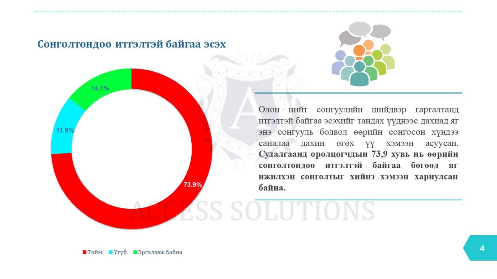 Судалгаанд нас насны төлөөллүүдээс сонгон оролцуулсан ба нийт оролцогчдын 73.9 хувь нь сонгуулийн үр дүнд сэтгэл хангалуун, сонголтондоо итгэлтэй байгаа гэх дүн гарсан ба дахин санал хураасан ч яг ижил сонголт хийнэ гэж хариулсан байна.