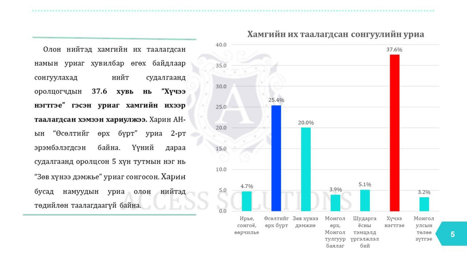 Нийгэм, улс төр, социологийн чиглэлээр судалгаа, шинжилгээ хийдэг томоохон мэргэжлийн байгууллага болох “Access Solutions” компаниас 2020 оны УИХ-ийн сонгууль, түүний үр дүнд судалгаа хийжээ.