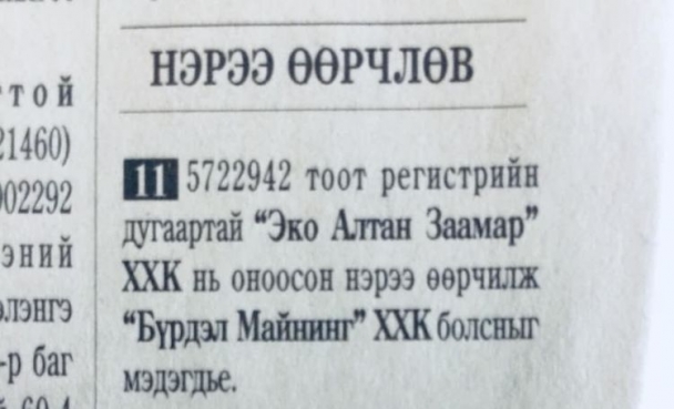 Энд эргэн сануулахад, 2019 оны есдүгээр сард Төв аймгийн Заамар суманд үйл ажиллагаа явуулдаг “Эко-Алтанзаамар” компанийн уурхайд нуранги үүсэж зургаан хүн осолдсон хэрэг гарсан. Онцгой байдлын аврагчид ослын газар олон хоногоор эрлийн шумбалт хийж, хоёрыг нь эсэн мэнд гаргаж, дөрвөн иргэний цогцсыг хайж, гаргаж авч байсан билээ. Гэвч тус компанийн үйл ажиллагааг одоог хүртэл зогсоогоогүй байгаа юм. Энэхүү ослын дараа буюу 2019 оны арванхоёрдугаар сард тус компани нэрээ сольж “Бүрдэл майнинг” нэрээр үйл ажиллагаагаа явуулж байна.