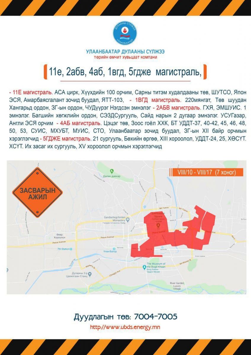 УБДС ТӨХК-с дулаан хангамжийн шугам тоноглолд 2020 оны зун хийх засвар үйлчилгээний ажилтай холбоотойгоор дараах байршлуудад VIII/10-VIII/17 хооронд хэрэглээний халуун усыг хязгаарлаж байна.