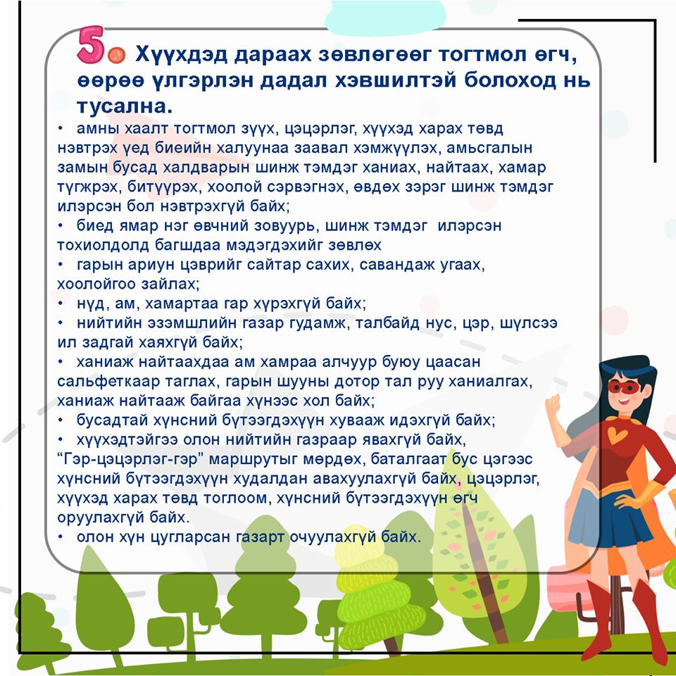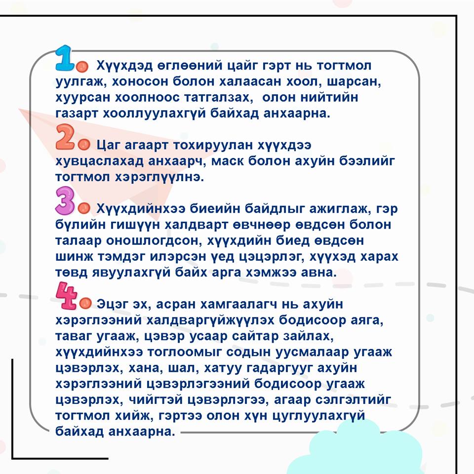 ГАДУУР САМАР ЗАРААД ХҮҮХДҮҮД НЬ БОХИР ГАРААРАА ЦӨМӨӨД ШҮЛСТЭЙ ГАРААРАА БҮХ ЗҮЙЛИЙГ БАРИАД ПАРТАН ДОР НЬ САСРНЫ ЯС БАЙДАГ6 ТЭР ҮЗЭГДЭЛ ДАВТАГДАХ ЮМ БОЛ МАСК ЗҮҮГЭЭД Ч НЭМЭР АЛГА6 ЕР НЬ ХИЛЭЭ НЭЭХГҮЙ БАЙСАН ДЭЭР БОЛЖ БАЙНА ХӨДӨӨНИЙ АЙЛЫН ХҮҮХДҮҮД АРИУН ЦЭВЭР САХИН ГЭЖ БАЙХ Ч ҮГҮЙ6 ТИЙМ СОЁЛ УГААС ЭЗЭМШЭЭГҮЙ. ЭЗЭМШИН ҮНДЭС Ч АЛГА.