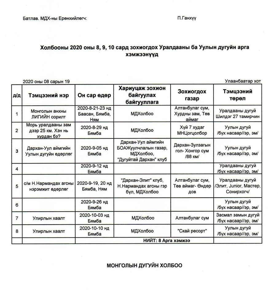 Мөн Монголын дугуйн холбооны Дасгалжуулагчдын зөвлөл хуралдаж, цар тахлын үед улирал дуустал зохион байгуулах арга хэмжээнүүдийн жагсаалтыг гаргалаа. Гэхдээ ирэх сарын 1-нээс хорио тавигдвал Хотын АШТ, Улсын АШТ болон “Бүх нийтийн дугуйн өдөрлөг” зэрэг арга хэмжээнүүд зохиогдох болно гэж Монголын Дугуйн холбооноос мэдээллээ.