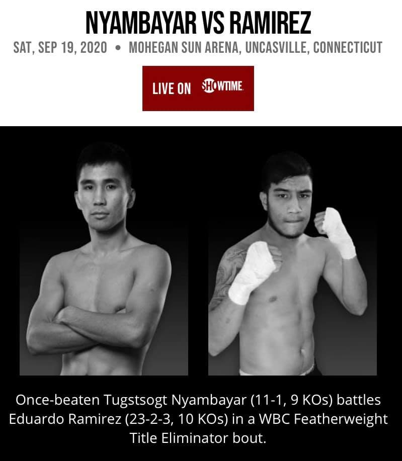Мэргэжлийн боксын IBO (International Boxing Organization) холбооны 57,2 кг-ийн жингийн Дэлхийн аварга болж, WBC (World boxing council) холбооны 57,2 кг-ийн жинд Дэлхийн аварга цол, бүсийн төлөө тулаанд өнгөрөгч хоёрдугаар сард тоглож, оноогоор ялагдсан “KING TUG” Нямбаярын Төгсцогт маань ирэх есдүгээр сарын 19-нд Мексикийн “Zurdito” ( Солгой) хочит Эдуардо Рамирес хэмээх боксчинтой 12 раунд , “title eliminator” статустай (хэн ялсан нь дараа нь дэлхийн аварга цолын төлөө тулалдах эрхтэй болно гэсэн үг) Коннектикут мужийн Анкасвилль хотын “Mohegan Sun Casino& Hotel” цогцолборын 12000 хүний суудалтай “ Mohegan Sun Arena” ордонд тулалдахаар болсон билээ.