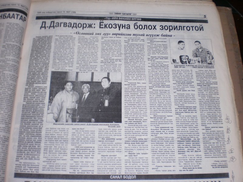 Д.Дагвадорж 18 настай. 1996 онд өсвөр үеийнхний үндэсний бөхийн барилдаанд түрүүлж, мэргэжилтэн бөх сонирхогчдын анхаарлыг гойд татсан залуу. Аль ч талаасаа бөхийн удамтай энэ залууд монголчууд их л итгэл найдвар тавьж байсан билээ. Гэтэл Д.Дагвадорж гэнэт сүмо бөхийн замыг сонгосонд харамсан, “Ээ дээ, үндэсний бөхөөр явсансан бол” хэмээн суугаа олон хүн байсан нь лавтай. Тиймээ, ирээдүйтэй залуу бөхийн тоонд зүй ёсоор багтаж явсан Д.Дагвадорж яагаад сүмо бөхийг сонгов оо? Энэ талаар Д.Дагвадоржоос өөрөөс нь илүү ярих, мэдэх хүн хэн байх билээ дээ.