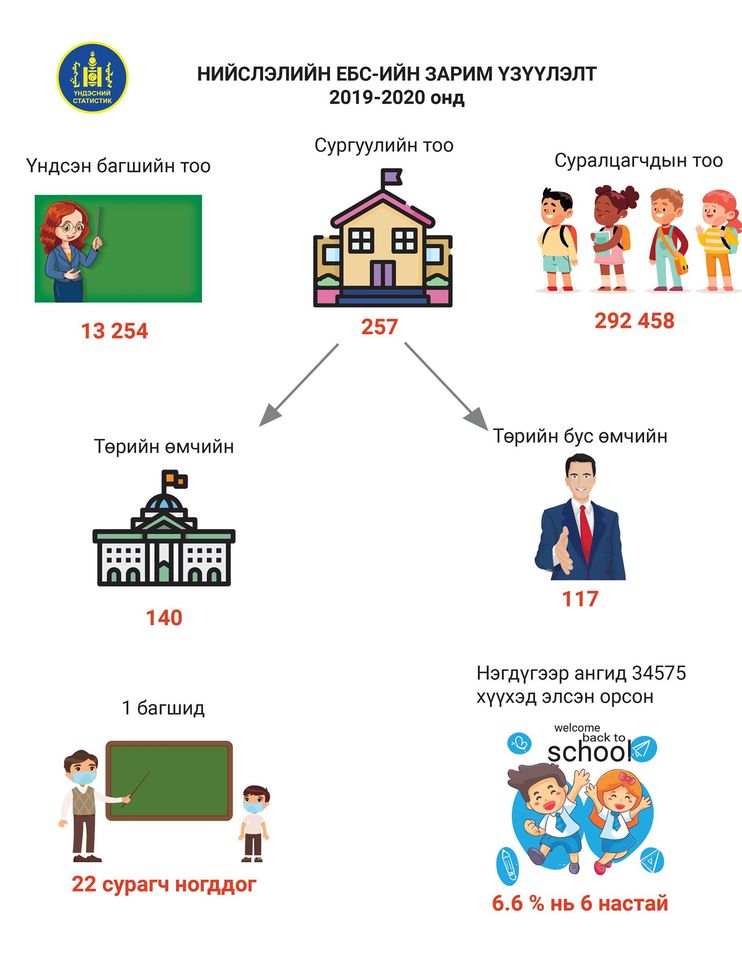 2019-2020 оны хичээлийн жилд улсын хэмжээнд нийт 640.4 мянган хүүхэд суралцсанаас нийслэлийн ерөнхий боловсролын сургуулиудад 292.4 мянган хүүхэд хамрагджээ.