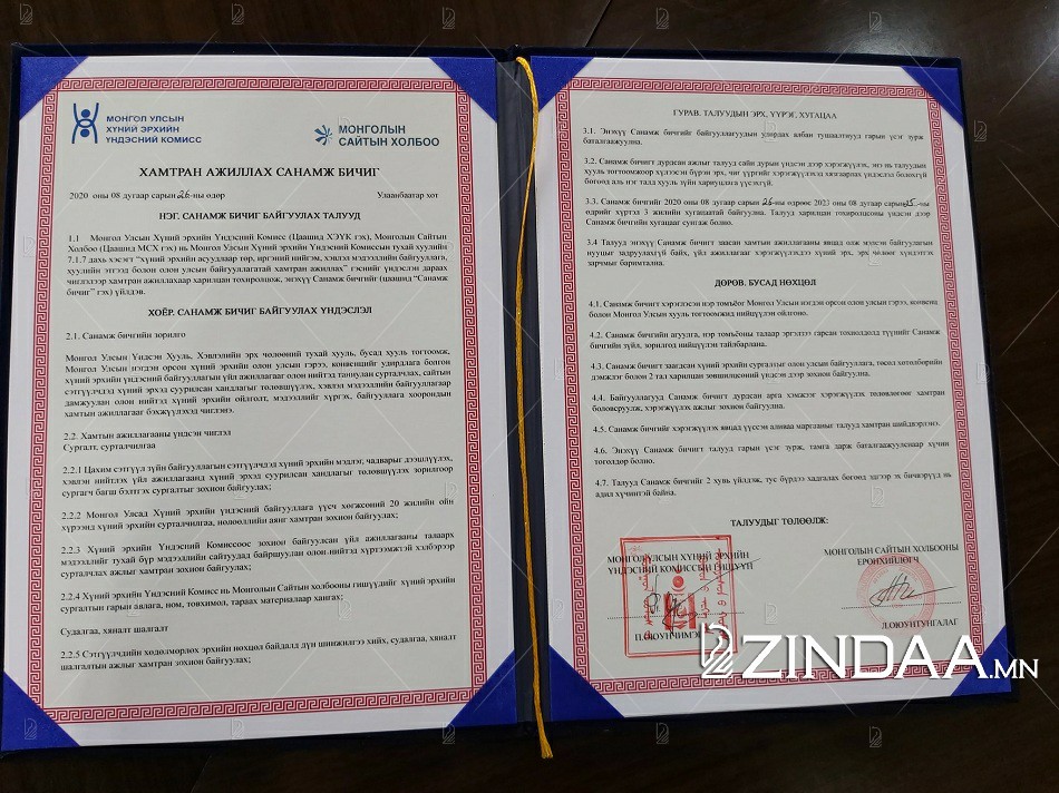 Монгол Улсын Хүний эрхийн үндэсний комис /ХЭҮК/, Монголын сайтын холбоо /МоСаХ/ өнөөдөр /2020.08.26/ хамтран ажиллах санамж бичиг байгууллаа. Талуудыг төлөөлж ХЭҮК-ын гишүүн П.Оюунчимэг, МоСаХ-ны Ерөнхийлөгч Л.Оюунтунгалаг нар санамж бичигт гарын үсэг зурав.