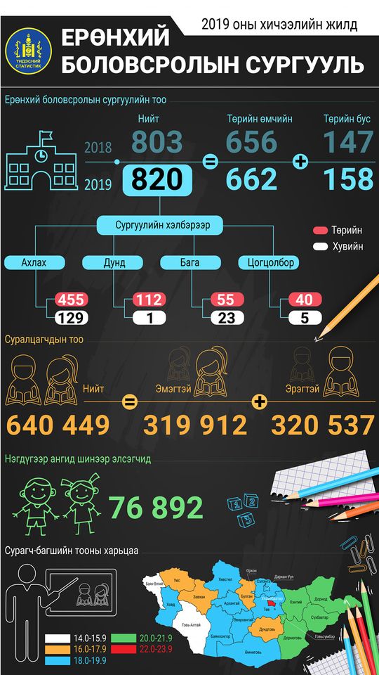 2019-2020 оны хичээлийн жилд Монгол Улсын хэмжээнд 820 сургууль үйл ажиллагаа явуулсны 662 нь төрийн өмчийн, 158 нь төрийн бус.