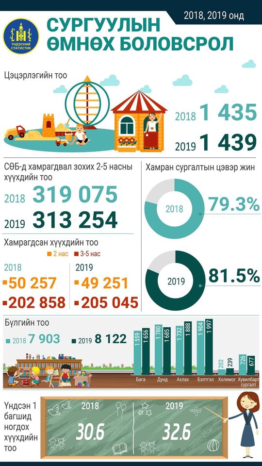 2019-2020 оны хичээлийн жилд 1439 цэцэрлэг үйл ажиллагаа явуулсан бөгөөд 2 настай 49.251, 3-5 настай 205.045 хүүхэд хамрагдсан байна.