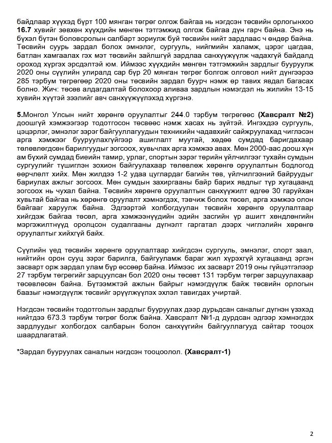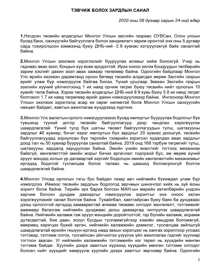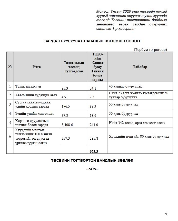 Төсвийн тогтовортой байдлын зөвлөлөөс нэгдсэн төсвийн алдагдлыг Монгол Улсын засгийн газраас ОУВСан, Олон улсын бусад банк, санхүүгийн байгууллага болон хандивлагч зарим оронтой энэ оны тавдугаар сард тохиролцсон хэмжээнд буюу ДНБ-ний -2.9 хувиас хэтрүүлэхгүй байх санал гаргаж, тэвчиж болох зардлуудыг санал болголоо. Тухайлбал, бүх шатны төсөвт байгууллагуудын түлш, шатахууны зардлыг 40 хувиар, бичиг хэрэг импортын бүх зардлыг 20 хувиас доошгүй,төсвийн байгууллагуудад зориулсан бүх төрлийн тээврийн хэрэгсэл худалдан авах зардлыг доод тал нь 50 хувиар бууруулах санал гаргалаа.