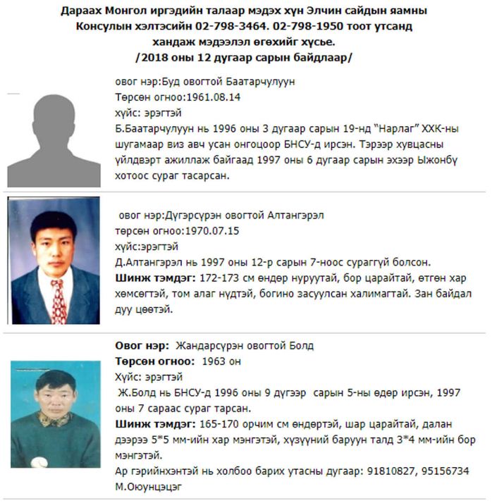 БНСУ-д ажиллаж амьдрахаар очоод сураггүй болсон Монголын 22 иргэн байдаг ба эдгээр иргэдийг ар гэрийнхнийх нь хүсэлтээр тус улсад суугаа Элчин сайдын яамнаас эрэн сурвалжлах ажлыг үргэлжлүүлсээр байгаа юм.
