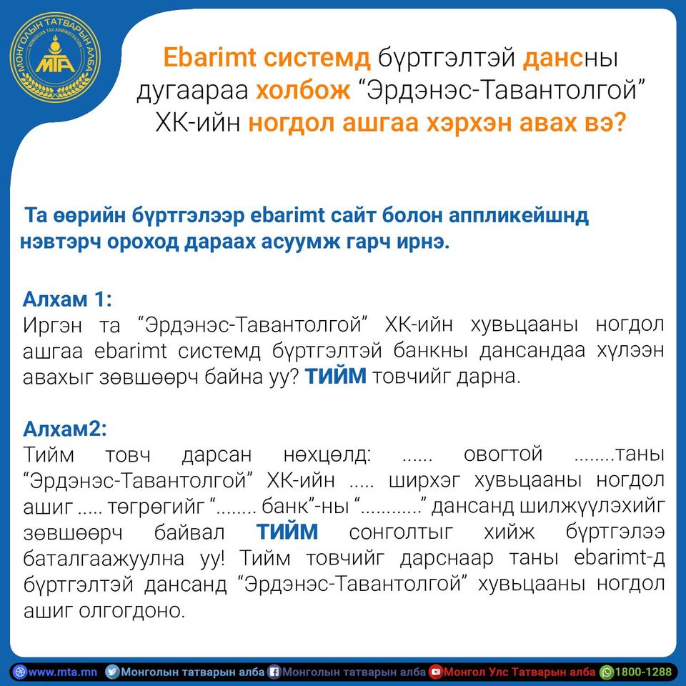 Хэрэв та хувьцааны дансгүй бол Ebarimt системд бүртгэлтэй дансны дугаараа холбож, “Эрдэнэс-Тавантолгой” ХК-ийн ногдол ашгаа авах боломжтойг сануулъя.