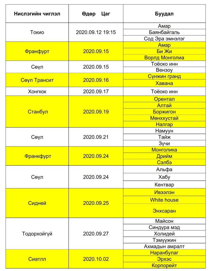 Тэгвэл УОК-ын Шуурхай штабаас дараагийн захиалгат нислэгүүдээр ирэх иргэдийг байршуулах  тусгаарлан ажиглах байруудын хуваарийг гаргасныг танилцуулж байна.