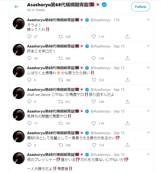 Тэрүнофүжид ялагдсаных нь дараа “Хаанахын озэки вэ? Тэнэг. Ичгэвэртэй юм. Ингэж барилдахаа болиоч” гэж эхлээд жиргэсэн.