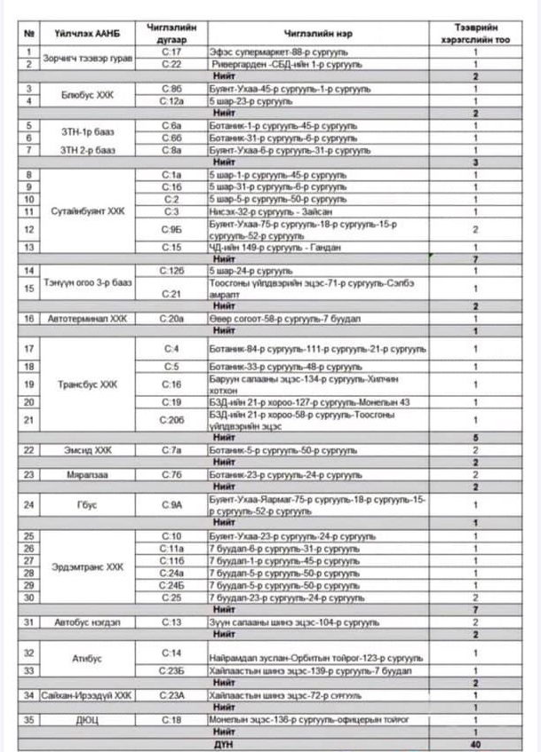 Нийслэлийн Засаг даргын 2019 оны “Сургуулийн автобус төсөл хэрэгжүүлэх тухай” А/1298 захирамжийн дагуу 2020-2021 оны хичээлийн жилд авто замын хөдөлгөөнд гол ачаалал үүсгэж буй ерөнхий боловсролын сургуулиудад болон хотын алслагдсан дүүргийн нийт 31 сургуулийг хамруулан 35 чиглэлд 40 автобусаар ирэх даваа гаригаас буюу есдүгээр сарын 21-нээс үнэ төлбөргүй үйлчилж эхлэх гэж байна.