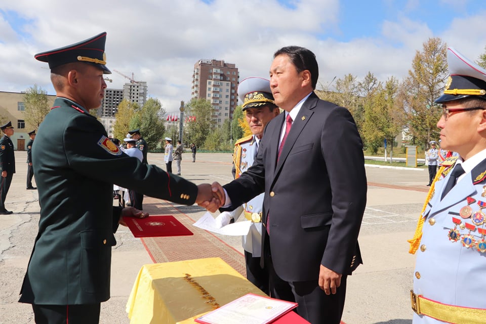 Мөн өнөөдрийн төгсөгчид та бүхэн “Улс орны батлан хамгаалах тогтолцоог боловсронгуй болгох, чадавхыг бэхжүүлэх” хэмээн тодорхойлсон алсын харааг хэрэгжүүлж, улс орноо өндөр чадамжтай Зэвсэгт хүчинтэй болгох их үйл хэргийн эзэд болж байгаагаараа онцлогтой юм.