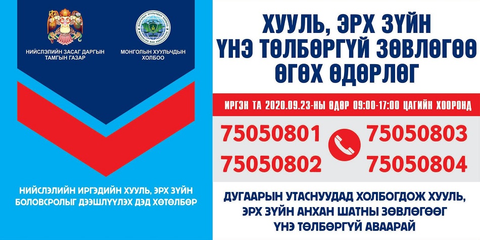 Энэ сарын өдөрлөг 2020 оны 09 дүгээр сарын 23-ны өдрийн 09:00-17:00 цагийн хооронд явагдах тул иргэн та /75050801, 75050802, 75050803, 75050804/ дугаарын утаснуудад холбогдож хууль, эрх зүйн зөвлөгөө, мэдээллийг авах боломжтой гэж Нийслэлийн Засаг даргын Тамгын газрын Хууль, эрх зүйн хэлтсээс мэдээлэв.