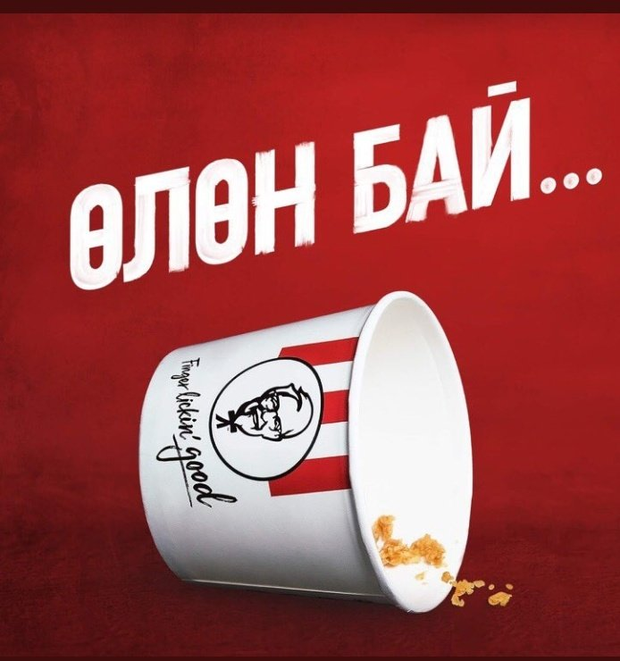 KFC international iin uriag buruu orchuulj sh.aaj bhgui yu manaihan bolson hoino.. ulun reklam bailaa, haha