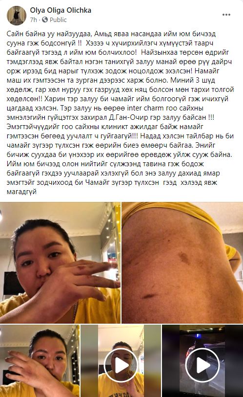 Тухайн үед комедиан Оля найзуудын хамт караокед байсан ба түүний биед халдсан этгээд өрөөнд нь хүчээр дайрч орж, зодсон талаар тэрбээр өөрийн нүүр хуудсаараа дамжуулан мэдэгдлээ.