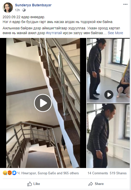 Б.Сүндэръяа өчигдөр (2020.09.22) фейсбүүк хуудастаа болсон явдлыг нийтэлж, бичлэг оруулсан юм.