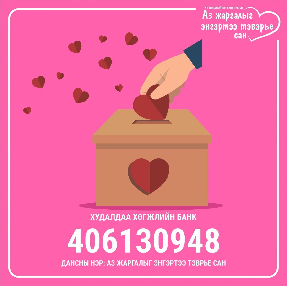 Үргүйдэлтэй гэр бүлд туслах “Аз жаргалыг энгэртээ тэвэрье” сангийнхан “Өөжинмед” үр шилжүүлэн суулгах төвд эмчлүүлж байгаа үйлчлүүлэгчдээс санхүүгийн хүндрэлийн улмаас эмчилгээгээ цаашид үргэлжлүүлэх боломжгүй болсон хосуудад туслах хандивын аяныг эхлүүлсэн юм.