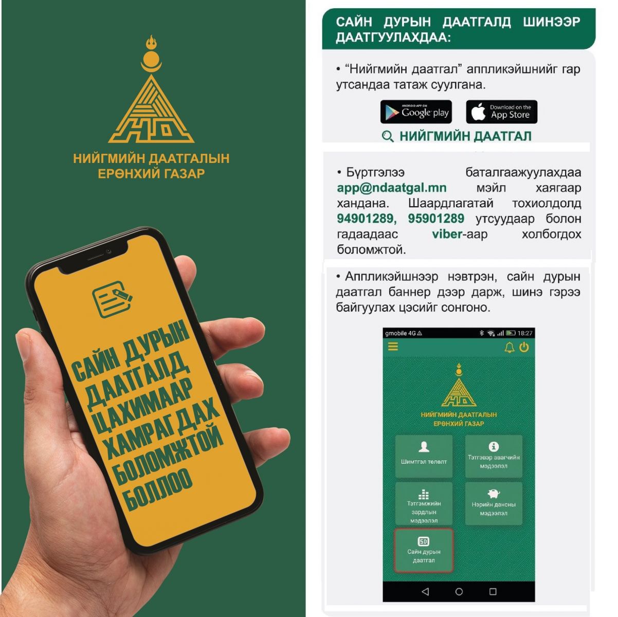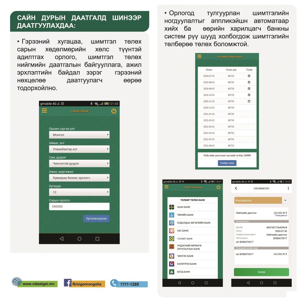 Үүний тулд иргэн та гар утсандаа “Нийгмийн даатгал” аппликэйшнийг суулгаарай.Ингэснээр дээрх үйлчилгээнүүдийг орон зай, цаг хугацааны хамааралгүй авахаас гадна шимтгэл төлөлтөө гар утаснаасаа хянах боломжтой.