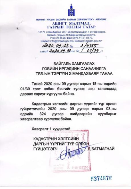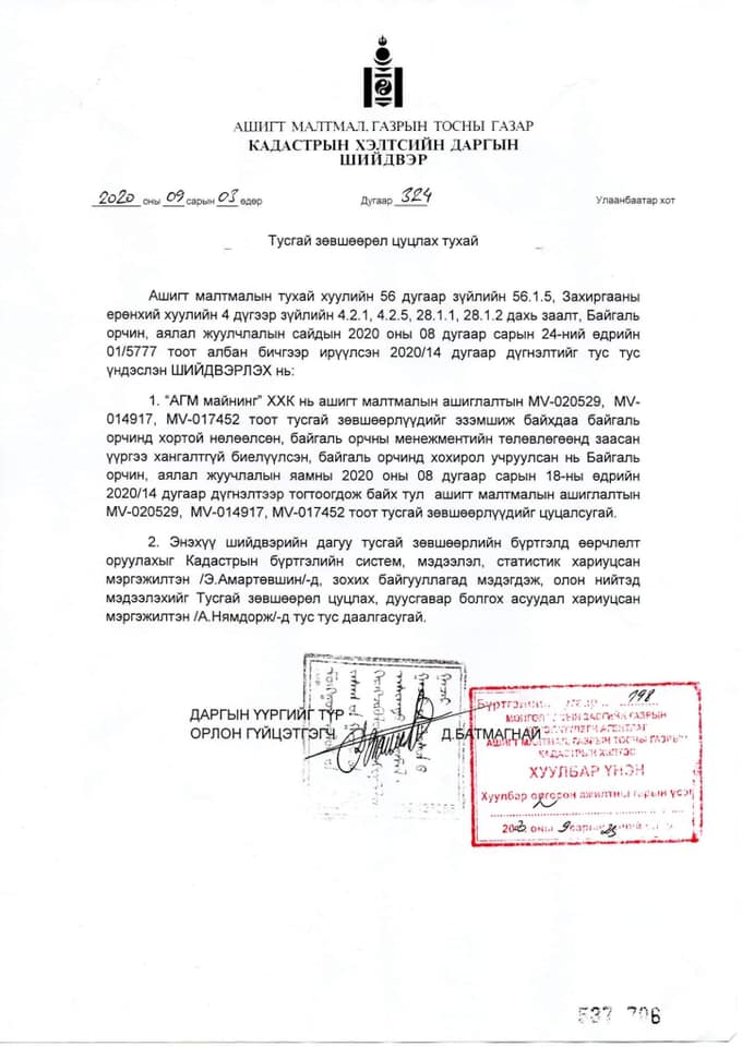 Ашигт малтмал, газрын тосны газраас олон хууль тогтоомж зөрчиж, иргэдийн эрх ашгийг хөсөрдүүлсэн Өмнөд Солонгосын 100 хувийн хөрөнгө оруулалттай “АГМ майнинг” ХХК-ийн ашигт малтмалын тусгай зөвшөөрлийг цуцалснаа албан ёсоор танилцуулжээ.