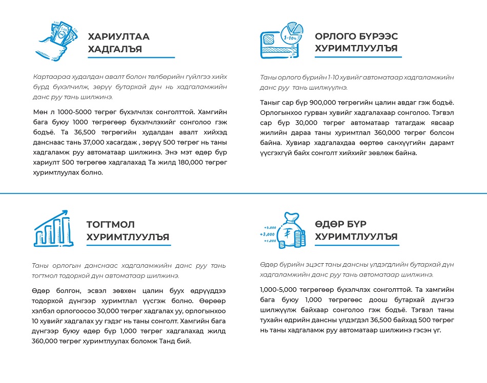 Дөнгөж эхэлж буй шинэ “хуримтлуулагч”-аас эхлээд туршлагатай “хуримтлуулагч” хүртэл хэн бүхэн “ХЯЛБАР ХУРИМТЛАЛ” үйлчилгээний 4 төрлийн аргаас ашиглах боломжтой. Тус үйлчилгээний 4 арга нь тус бүрдээ онцлогтой.