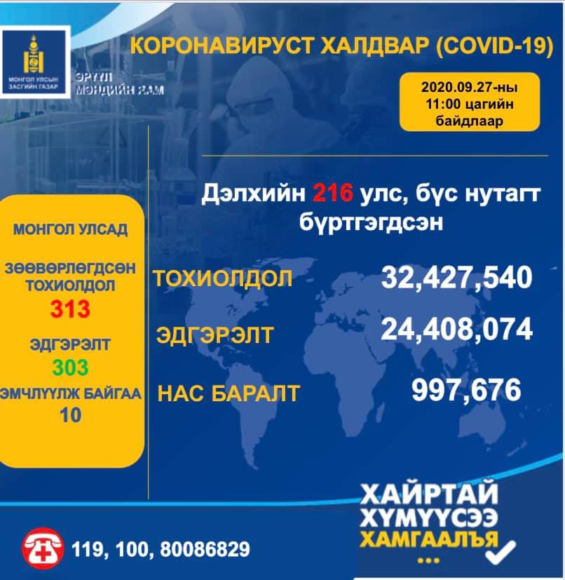 Өнөөдөр /2020.09.27/ ХӨСҮТ-ийн Вирус судлалын лаборатори, Дархан-Уул аймгийн вирус судлалын салбар лабораторид нийт 554 сорьцод шинжилгээ хийхэд коронавирус илрээгүй талаар ЭМЯ-наас мэдээллээ.