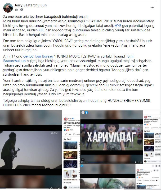 "...Энэ бүр арай тэвчээр барагдуулж, бухимдуулж байна. Миний хөдөлмөр болж, ямар ч ашиг сонирхолгүй "PLAYTIME 2018"-ын тухай хийсэн бичлэгээс хэсэг дүрсийг ямар ч зөвшөөрөлгүй, хулгайгаар татан оруулж, HYB гэсэн патенттай логог маань устгаад өөрсдийн KFC гэсэн логогоо тавьж, дундуур нь тахианы бичлэг оруулж, зар сурталчилгаа хийсэн байна. Бас ичихгүй миний нүүр царайг ашигласан. Энэ том байгууллага "ӨЛӨН БАЙ" гэдэг маркетингаар ажилладаг юм уу. Уран бүтээлч гэдэг хүний оюуны хөдөлмөрийг хүндлэхгүй, үнэлэхгүй байгаа энэ хандлага үнэхээр уур хүргэж байна" гэхчлэн бухимджээ.