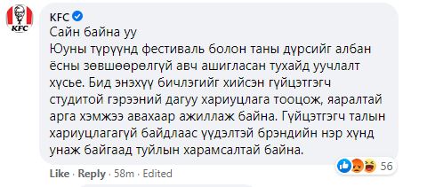 Jerry Baatarchuluun-ы энэхүү постны дор KFC Mongolia уучлал хүсэж, дараах сэтгэгдлийг бичсэн байв. Харин өөрсдийн пэйж хуудсанд байршуулсан сурталчилгаагаа устгасан байлаа.