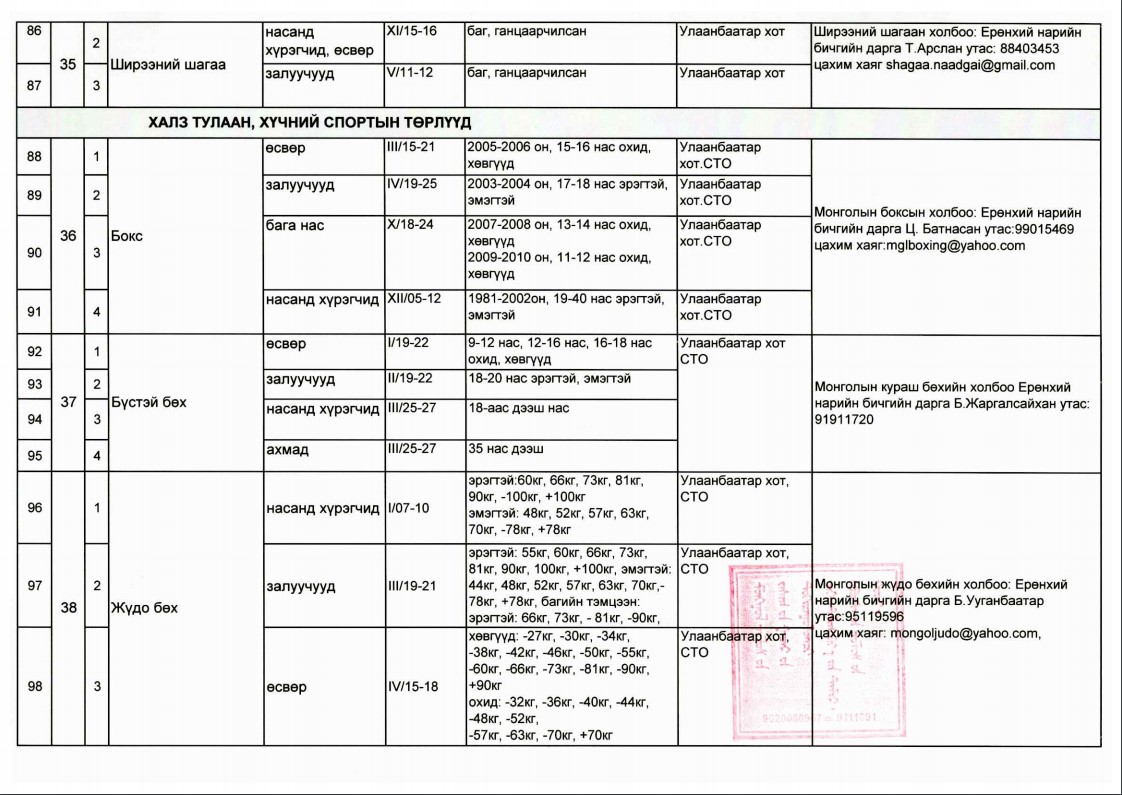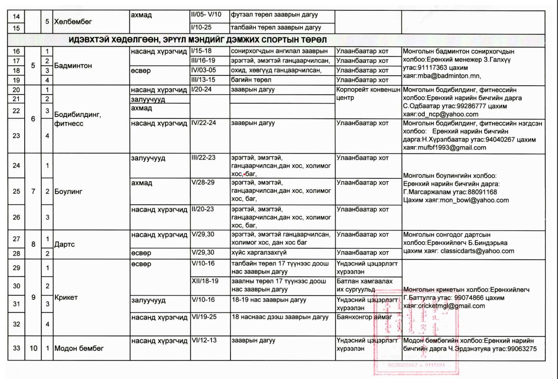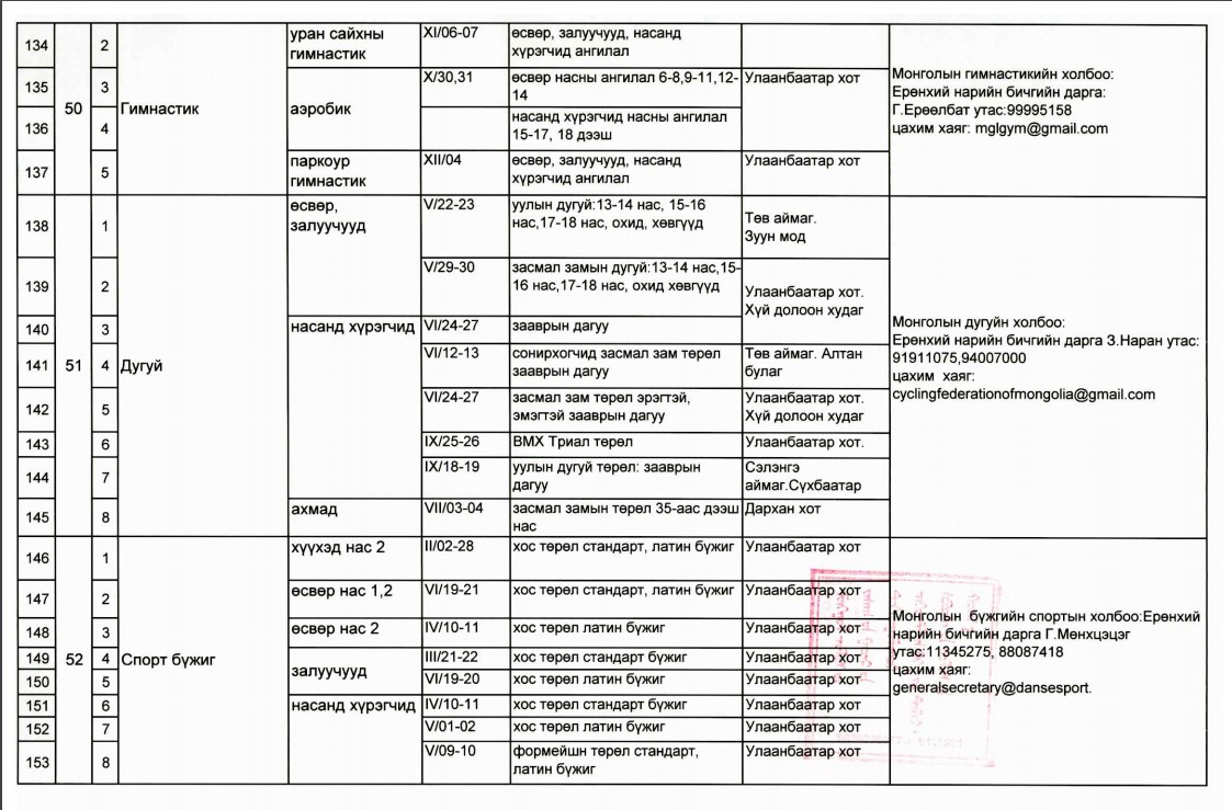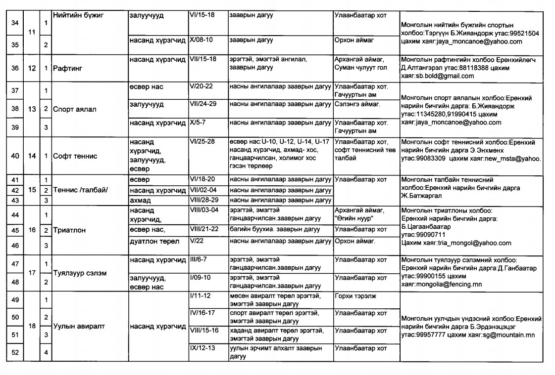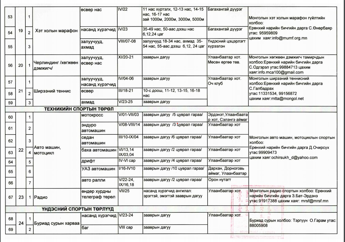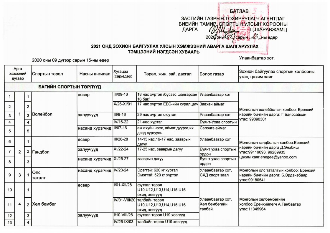 Биеийн тамир, спортын улсын хорооноос ирэх 2021 онд зохион байгуулагдах "Улсын аварга шалгаруулах тэмцээн"-үүдийн нэгдсэн хуваарийг баталжээ.