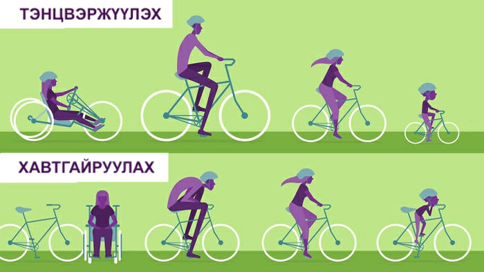 Тэгвэл зургийн дээд хэсэгт дүрсэлсэн ТЭНЦВЭРЖҮҮЛСЭН хуваарилалтын үед бүх иргэд тэгш боломжоор хангагдаж, дугуйг бүгд таатайгаар хэрэглэх юм. Хөгжлийн бэрхшээлтэй хүнд гараар жолооддог дугуй, хүүхдэд хүүхдийн дугуй хэрэгтэй.