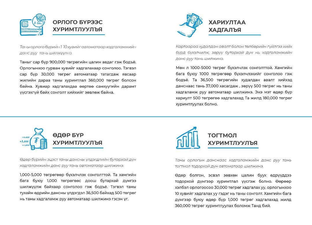 Дөнгөж эхэлж буй шинэ “хуримтлуулагч”-аас эхлээд туршлагатай “хуримтлуулагч” хүртэл хэн бүхэн “ХЯЛБАР ХУРИМТЛАЛ” үйлчилгээний 4 төрлийн аргаас ашиглах боломжтой. Тус үйлчилгээний 4 арга нь тус бүрдээ онцлогтой.