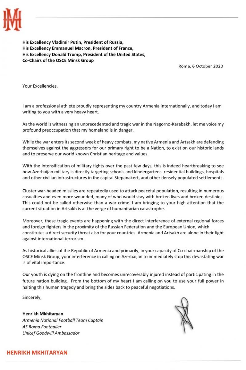 Армений шигшээ, Италийн “Рома” багийн тоглогч Генрих Мхитарян ОХУ, АНУ, Францын Ерөнхийлөгч нарт хандан, нээлттэй захидал илгээжээ.