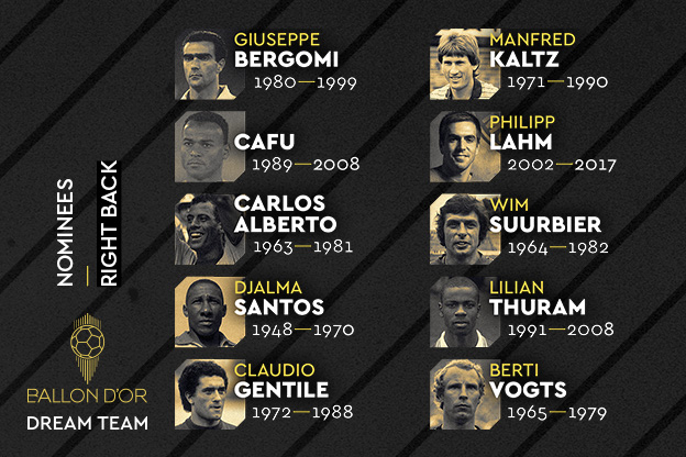 Францын France Football сэтгүүлийн газраас хүн төрөлхтний түүхэн дэх хамгийн шилдэг “Мөрөөдлийн баг” шинэ төсөл хэрэгжүүлж эхэллээ. Энэ багийг 3-4-3 схемээр гаргана. Байрлал болгонд 10 тоглогч нэр дэвшүүлж, сэтгүүлчдийн саналаар шилдгийг тодруулах юм. Энэ удаад шилдэг баруун жигүүрийн хамгаалагчид нэр дэвшигчдийг танилцуулжээ.