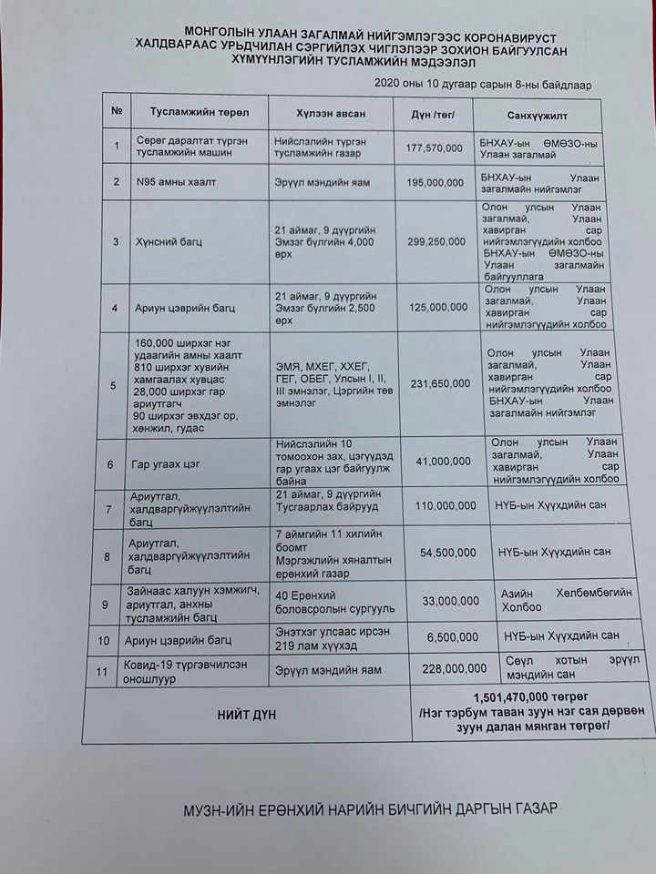 Нийт 228.000.000 төгрөгийн үнэ бүхий 10.000 ширхэг оношлуурыг Улаанзагалмайн нийгмэлэг БНСУ-ын Сөүл хотын Эрүүл мэндийн Үйлчилгээний сантай хамтран оруулж ирсэн байна. Энэхүү оношлуур нь хүний биеийн цусанд ковид-19-ийн эсрэг биет байгаа эсэхийг түргэвчилсэн байдлаар оношлох зориулалттай юм.