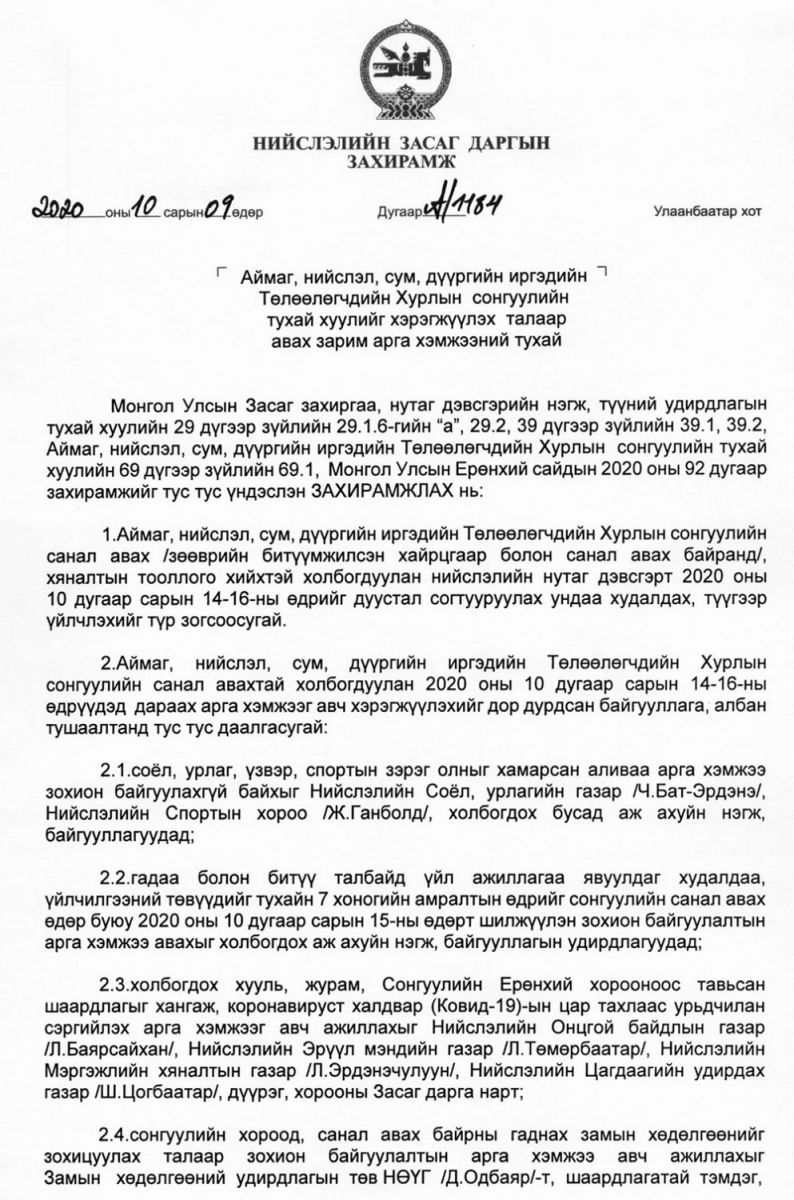Захирамжид “Аймаг, нийслэл, сум, дүүргийн иргэдийн Төлөөлөгчдийн хурлын сонгуулийн санал авах /зөөврийн битүүмжилсэн хайрцгаар болон санал авах байранд/, хяналтын тооллого хийхтэй холбогдуулан нийслэлийн нутаг дэвсгэрт 2020 оны 10 дугаар сарын 14-16-ны өдрийг дуустал согтууруулах ундаа худалдах, түүгээр үйлчлэхийг түр зогсоосугай” гэжээ.