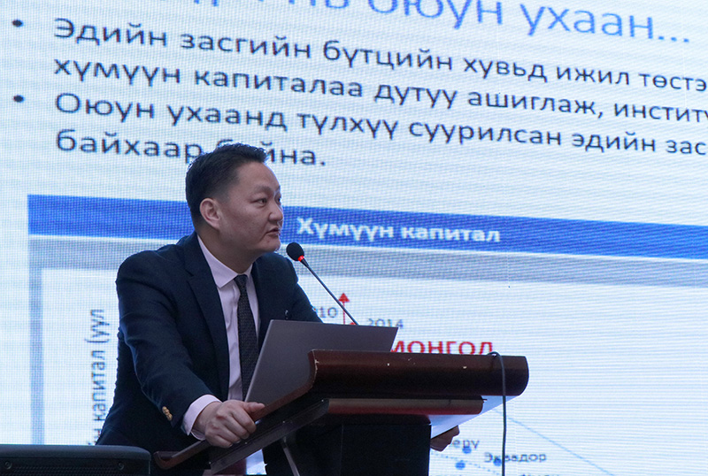 Хэлэлцүүлэгт Дэлхийн банкны эдийн засагч Б.Даваадалай “Уул уурхай ба Урт хугацааны тогтвортой өсөлт” сэдвээр илтгэл танилцуулсан. Дэлхийн банкнаас манай улсад хийсэн эдийн засгийн хөгжлийн загварын тойм судалгааны хүрээнд тэрбээр мэдээлэл өгсөн юм.