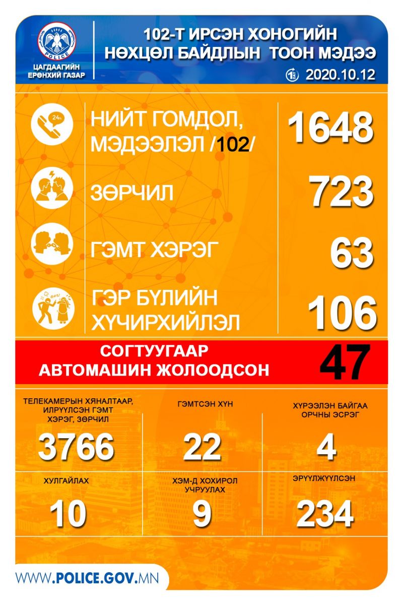 Цагдаагийн ерөнхий газраас 102 дугаарт ирсэн гэмт хэрэг, зөрчил, гомдлын нөхцөл байдлын хоногийн тоон мэдээллийг олон нийтэд өдөр бүр танилцуулдаг болсон.