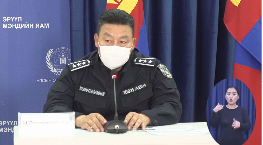 Эрүүл мэндийн яам (ЭМЯ)-ны өнөөдрийн (2020.10.14) ээлжит хэвлэлийн хурлын үеэр Цагдаагийн ерөнхий газрын Нийтийн хэв журам хамгаалах, олон нийтийн аюулгүй байдлыг хангах албаны дарга, цагдаагийн хурандаа Н.Лхагвасайхан мэдээлэл хийлээ.