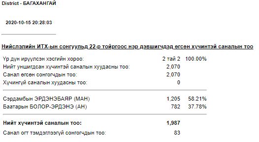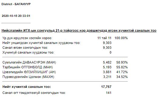 Та ИТХ-ын сонгуулийн урьдчилсан дүнг ЭНД ДАРЖ харах боломжтой.