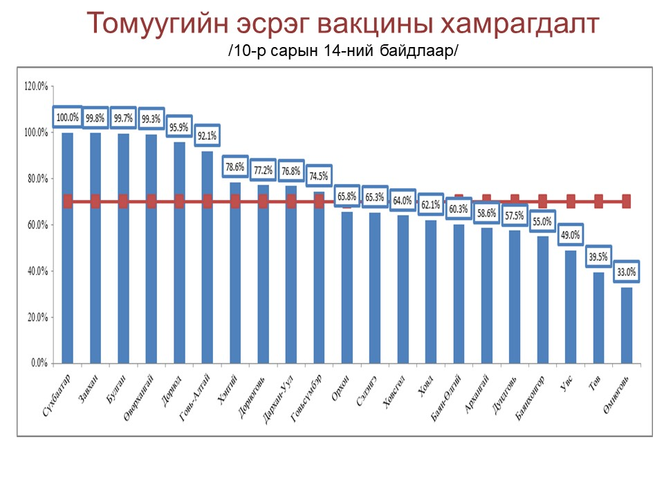 Томуугийн эсрэг дархлаажуулалт “Томуугаас сэргийлье” уриан дор орон даяар явагдаж байгаа. Тэгвэл томуугийн эсрэг дархлаажуулалтын хамралт Сүхбаатар, Булган, Завхан аймагт 99-100 хувь байна. Харин Увс, Төв, Өмнөговь аймагт 50-аас доош хувь байна гэж Эрүүл мэндийн яамнаас мэдээллээ.