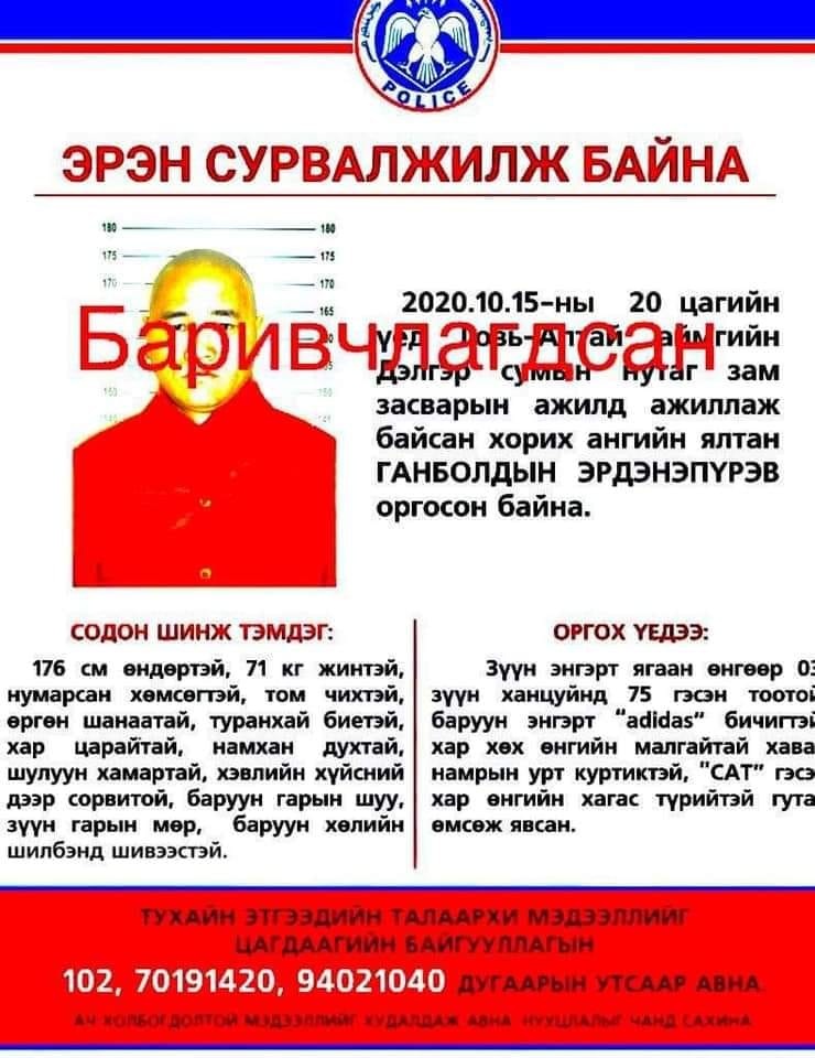 Говь-Алтай аймгийн Дэлгэр сумаас зүүн тийш 70 км-т тус сумын Баян-Өндөр багийн Тангуу-Эх гэх газарт авто зам дээр гэрээгээр ажиллаж байсан хорих ангийн ялтан Г.Эрдэнэпүрэв энэ сарын 15-нд оргосон байдаг. Шүүхийн шийдвэр гүйцэтгэх байгууллага, Цагдаагийн байгууллага хамтран эрэн сурвалжлах ажиллагааг үр дүнтэй зохион байгуулж, хоригдлыг өнөө өглөө /2020.10.17/ тус сумын нутаг дэвсгэрээс олж, баривчилжээ.