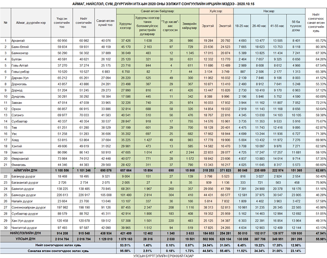 Үүнээс гадна аймаг, нийслэл, сум, дүүргийн ИТХ-ын 2020 оны ээлжит сонгуулиар сонгогчдын нэрийн жагсаалтад бүртгэгдсэн 2,016794 сонгогчдын 55,98 хувь буюу 1,129,010 сонгогч саналаа өгчээ.