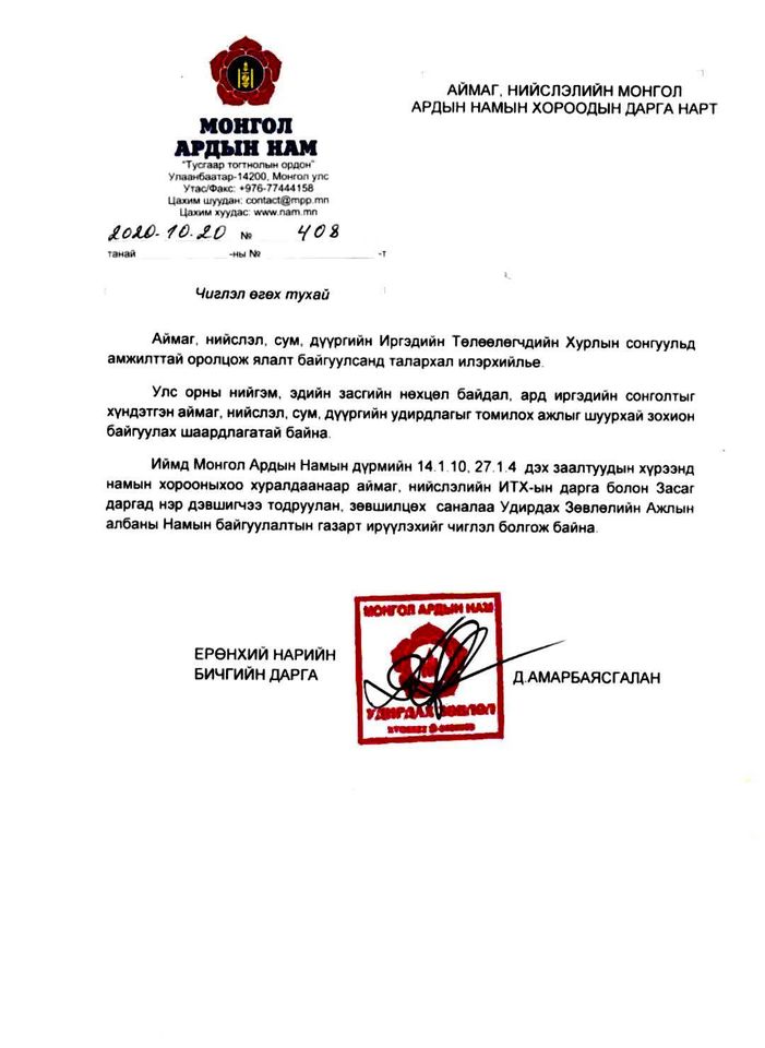Аймаг, нийслэл, сум, дүүргийн ИТХ-ын ээлжит сонгуульд ялалт байгуулсан МАН-ын Удирдах зөвлөлөөс аймаг, нийслэлийн МАН-ын хороодын дарга нарт чиглэл өгчээ.